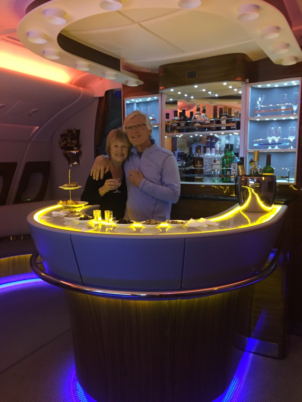 I admit, I am a real flying snob. But this airline is incredible. Better....much better the Singapore Air A380 that we took to Europe last year. This plane was immaculate. Business Class was huge, with every type of electronics at your fingertip. Let's just say the color scheme was Gold. In millions of miles of flying, I have never had a wine sommelier come to my seat to help me chose a wine to perfectly match my dinner selection. I had a delicious salmon (it was excellent), and Shelley had beef. She enjoyed hers, and she is very particular. After dinner, I discovered this great bar (above) at the back of Business Class. This really nice Flight Attendant from the Dominican Republic was our host and would make us any after dinner drink we could possibly ask for. Would you like an aged Whiskey. Done. 50 year old Port...done. We got two glasses of Bailey's "Up" and were delighted to sip on that. It was really fun. She was a delightful hostess, which again, goes to show you what an incredible airline this is, down to every detail including their Flight Attendants.